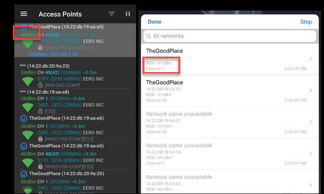 On mobile devices, install the app Wifi Analyzer for Android devices and Airport Utility App for iOS devices.